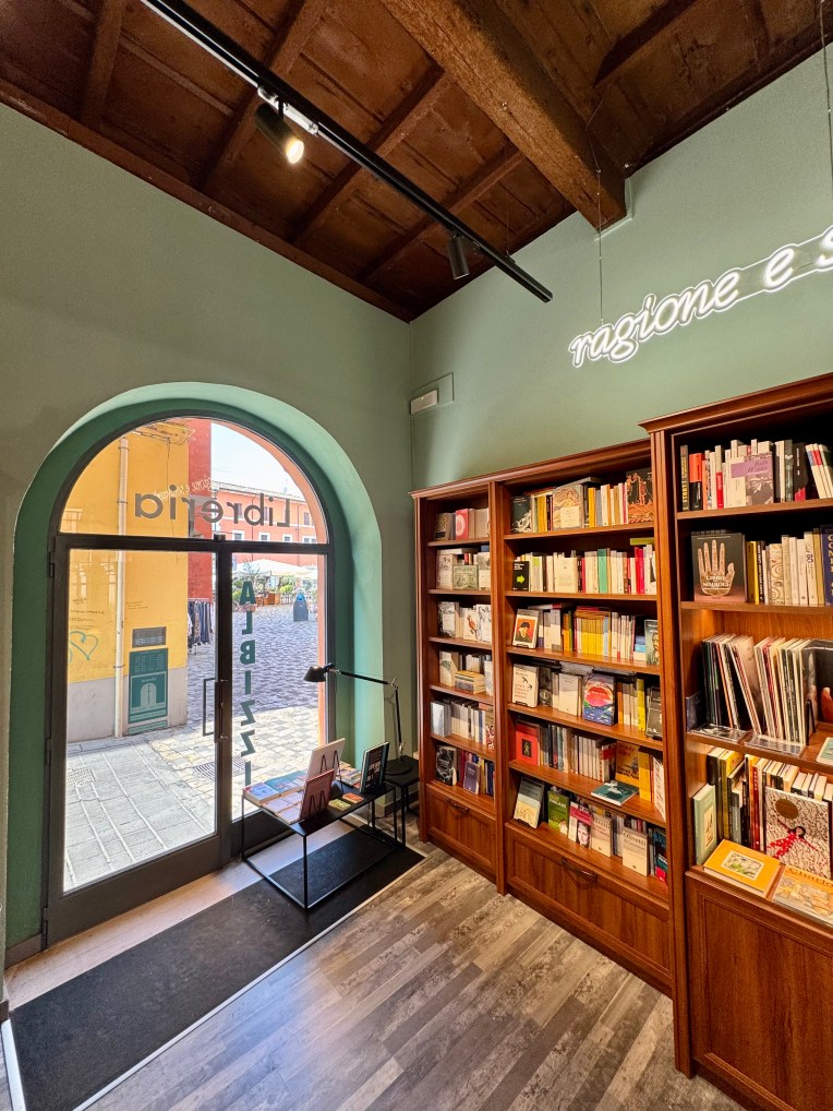 Due mesi fa ha inaugurato Libreria ALBIZZI, di cui ho progettato e curato allestimento, arredamento e grafica. Si tratta di una libreria indipendente con un forte carattere identitaria, per tanti aspetti. Innanzitutto la scelta del titolare, Enrico Chiudinelli, di costruire un luogo dove vari linguaggi creativi si incontrano e dialogano, dove ci si possa fermare per una sosta rilassante fra libri, film e musica, ma anche dove poter leggere, scrivere, partecipare a incontri di lettura, presentazioni, book party, laboratori e altro, e dove ogni libro, vinile, cd, dvd, oggetto viene scelto per la sua bellezza, cura e qualità. E poi, ma non casualmente, c’è il luogo in cui Libreria ALBIZZI è situata. Si trova nel cuore del centro storico di Cesena. in palazzo ALBIZZI (XV sec.) L’ingresso della libreria affaccia sull’omonima piazzetta e le finestre interne lasciano vedere la corte interna e la loggia del palazzo. Ho perciò progettato l’allestimento e l’arredo dello spazio interno tenendo conto di tutti questi elementi e della necessità di rendere il luogo accogliente e ordinato, in un’atmosfera calda e rilassante, sia nei momenti usuali che in quelli che ospitano eventi sia all’interno che all’esterno della Libreria.