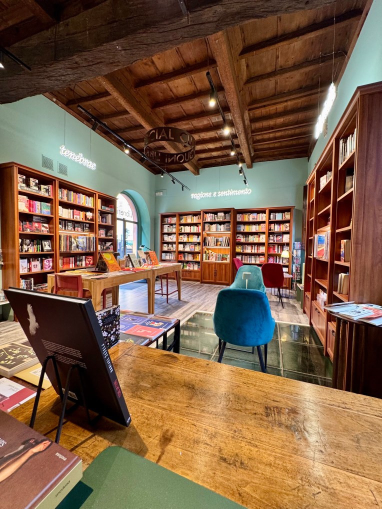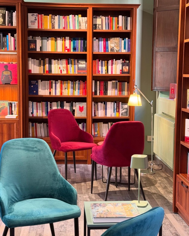Le sezioni tematiche sono evidenziate da evocative scritte luminose che si riflettono sul verde delle pareti e sui vetri di una porzione di pavimento, che rendono visibile un prezioso pozzo romano custodito nell’interrato del locale. Ho scelto di lasciare le vetrine il più libere possibile, in modo che, oltre ad una piccola e curata selezione di libri in evidenza, la visione degli. interni che ne traspare sia essa stessa “vetrina”, o meglio, invito alla scoperta (del luogo e di ciò che vi è contenuto).