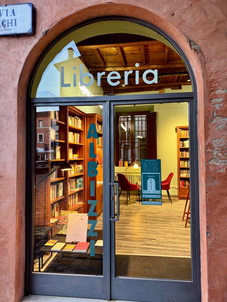 Due mesi fa ha inaugurato Libreria ALBIZZI, di cui ho progettato e curato allestimento, arredamento e grafica. Si tratta di una libreria indipendente con un forte carattere identitaria, per tanti aspetti. Innanzitutto la scelta del titolare, Enrico Chiudinelli, di costruire un luogo dove vari linguaggi creativi si incontrano e dialogano, dove ci si possa fermare per una sosta rilassante fra libri, film e musica, ma anche dove poter leggere, scrivere, partecipare a incontri di lettura, presentazioni, book party, laboratori e altro, e dove ogni libro, vinile, cd, dvd, oggetto viene scelto per la sua bellezza, cura e qualità. E poi, ma non casualmente, c’è il luogo in cui Libreria ALBIZZI è situata. Si trova nel cuore del centro storico di Cesena. in palazzo ALBIZZI (XV sec.) L’ingresso della libreria affaccia sull’omonima piazzetta e le finestre interne lasciano vedere la corte interna e la loggia del palazzo. Ho perciò progettato l’allestimento e l’arredo dello spazio interno tenendo conto di tutti questi elementi e della necessità di rendere il luogo accogliente e ordinato, in un’atmosfera calda e rilassante, sia nei momenti usuali che in quelli che ospitano eventi sia all’interno che all’esterno della Libreria.