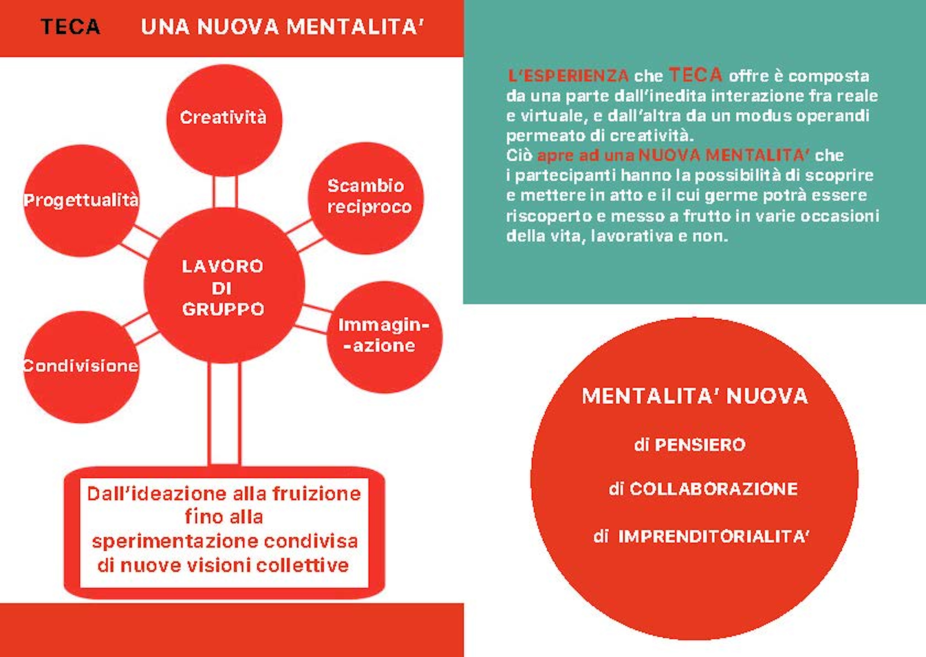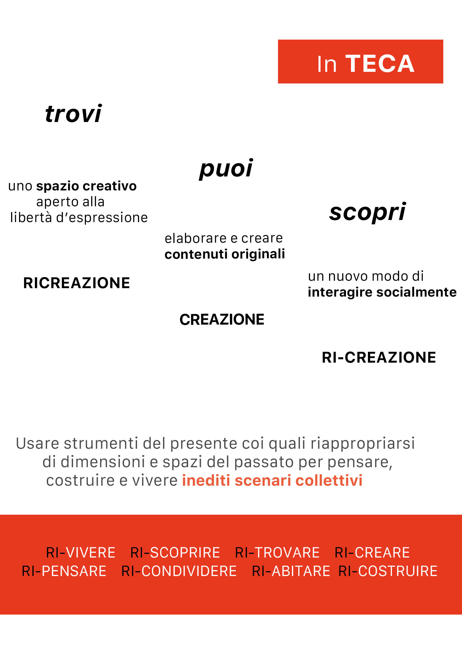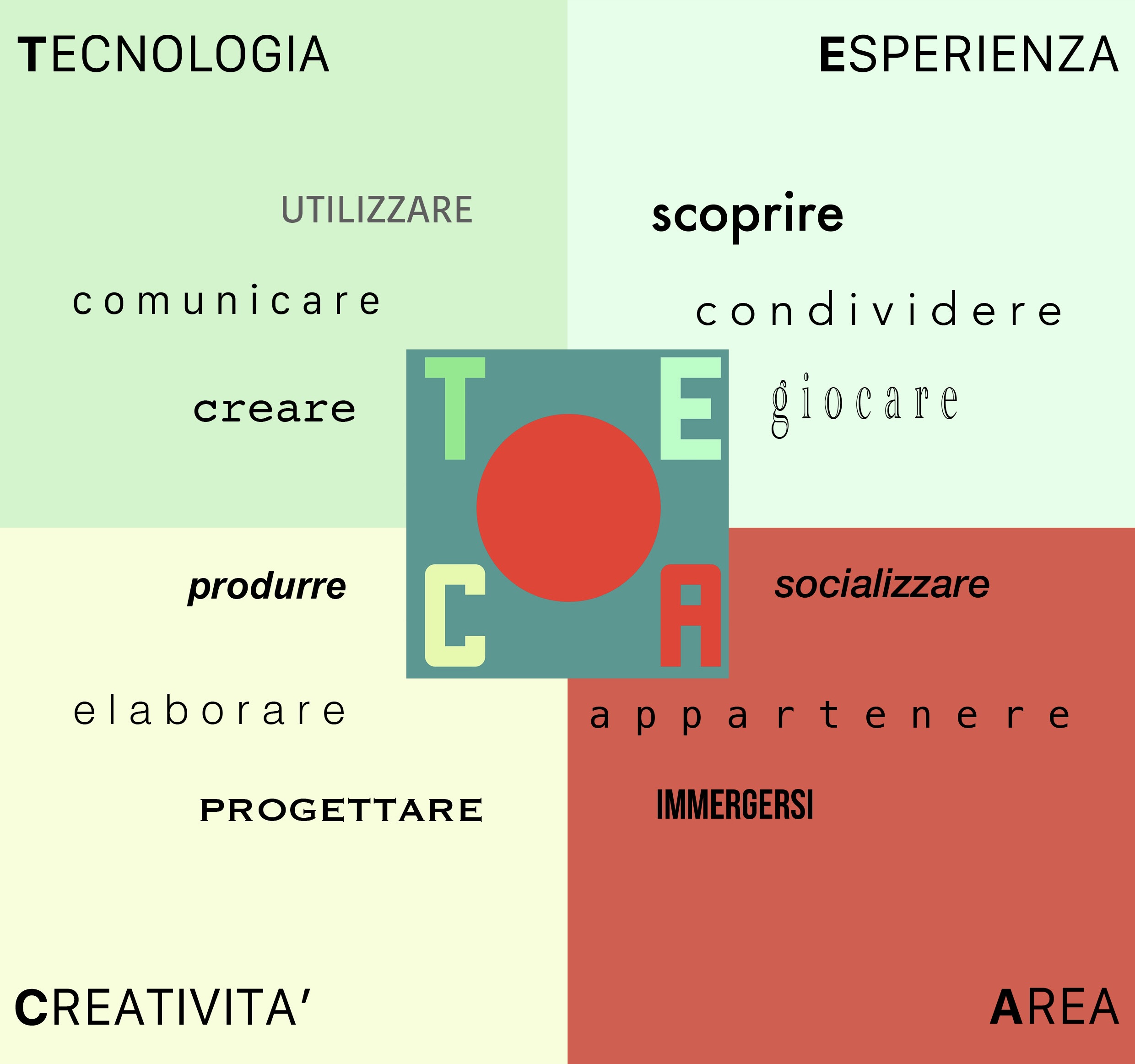 TECA è uno spazio creativo, fra digitale e reale, principalmente rivolto ai giovani. È uno spazio articolato in tre percorsi e flessibile per potersi adattare alle evoluzioni dei Percorsi Esperienziali attuali. Ne ho progettato e realizzato logo, grafica e illustrazioni. Ne ho progettatato e curato struttura interna, arredi e scenografie. L’ideazione e progettazione di TECA e dei Percorsi Esperienziali sono di Enrico Chiudinelli.